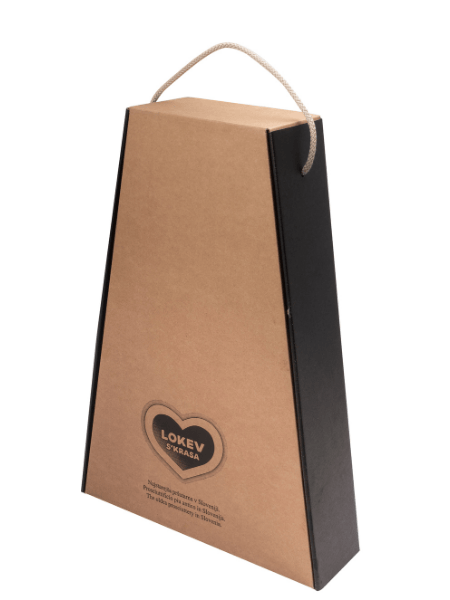 Darilna škatla za pršut Pršutarne Lokev je elegantna embalaža, popolna za podarjanje kraških dobrot. Izdelana je iz kakovostnega, trpežnega kartona z značilnim logotipom Lokev s’Krasa in priročnim ročajem za enostavno prenašanje.